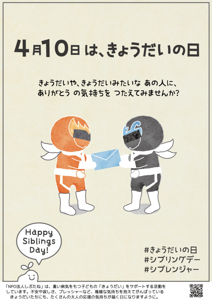 きょうだいの日(シブリングデー)は、父の日、母の日の、きょうだい版の記念日です(病気や障がいのあるなしにかかわらず、すべてのきょうだいの日です。男女や年齢の区別なく兄弟姉妹を表すひらがな表記を使っています)。